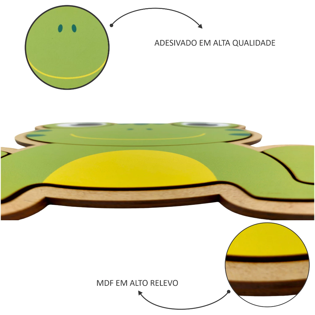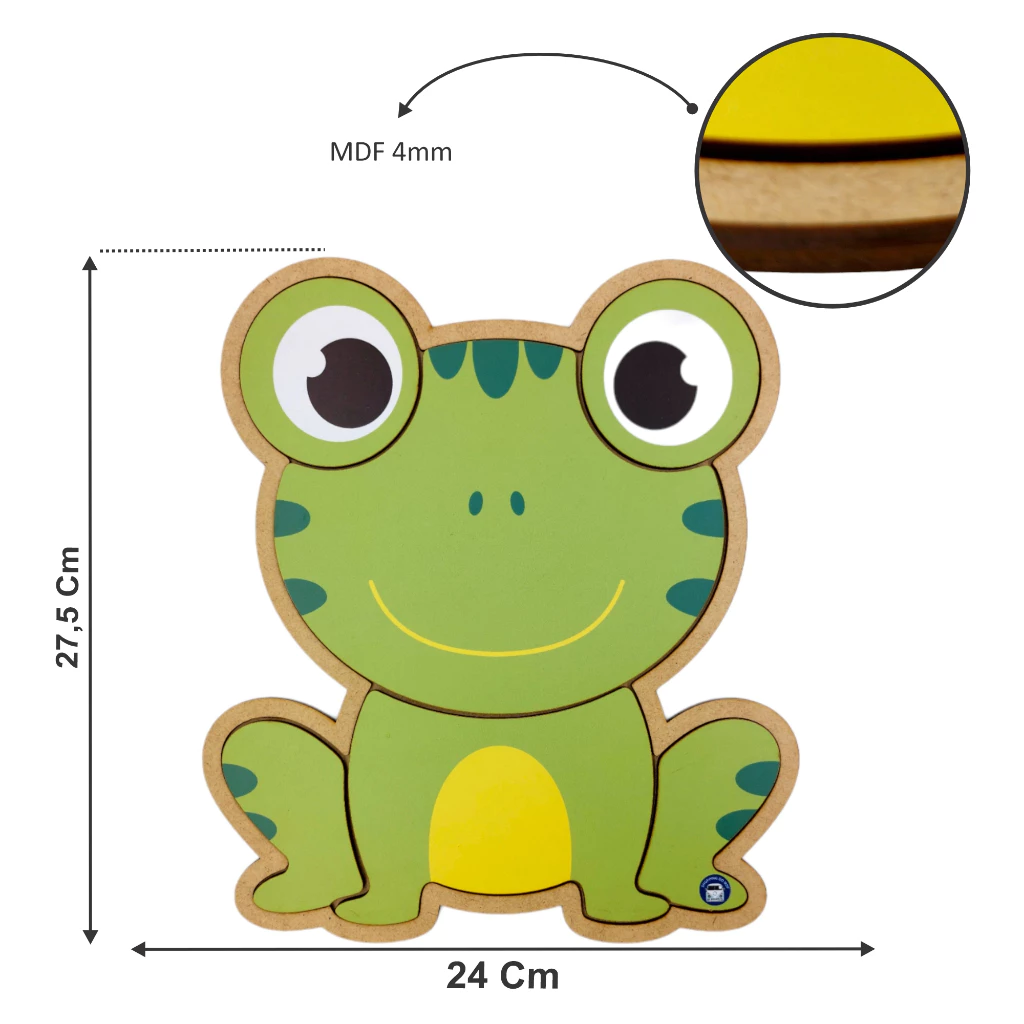 Este quebra-cabeça educativo em MDF alia diversão e aprendizado de maneira segura e eficaz. O design com a figura de sapo estimula a curiosidade das crianças em aprender sobre formas e animais, enquanto as peças de encaixe reforçam noções de espaço, cores e sequência lógica. A construção em MDF garante resistência ao brinquedo mesmo com uso contínuo, ideal para ambientes domésticos ou educativos.