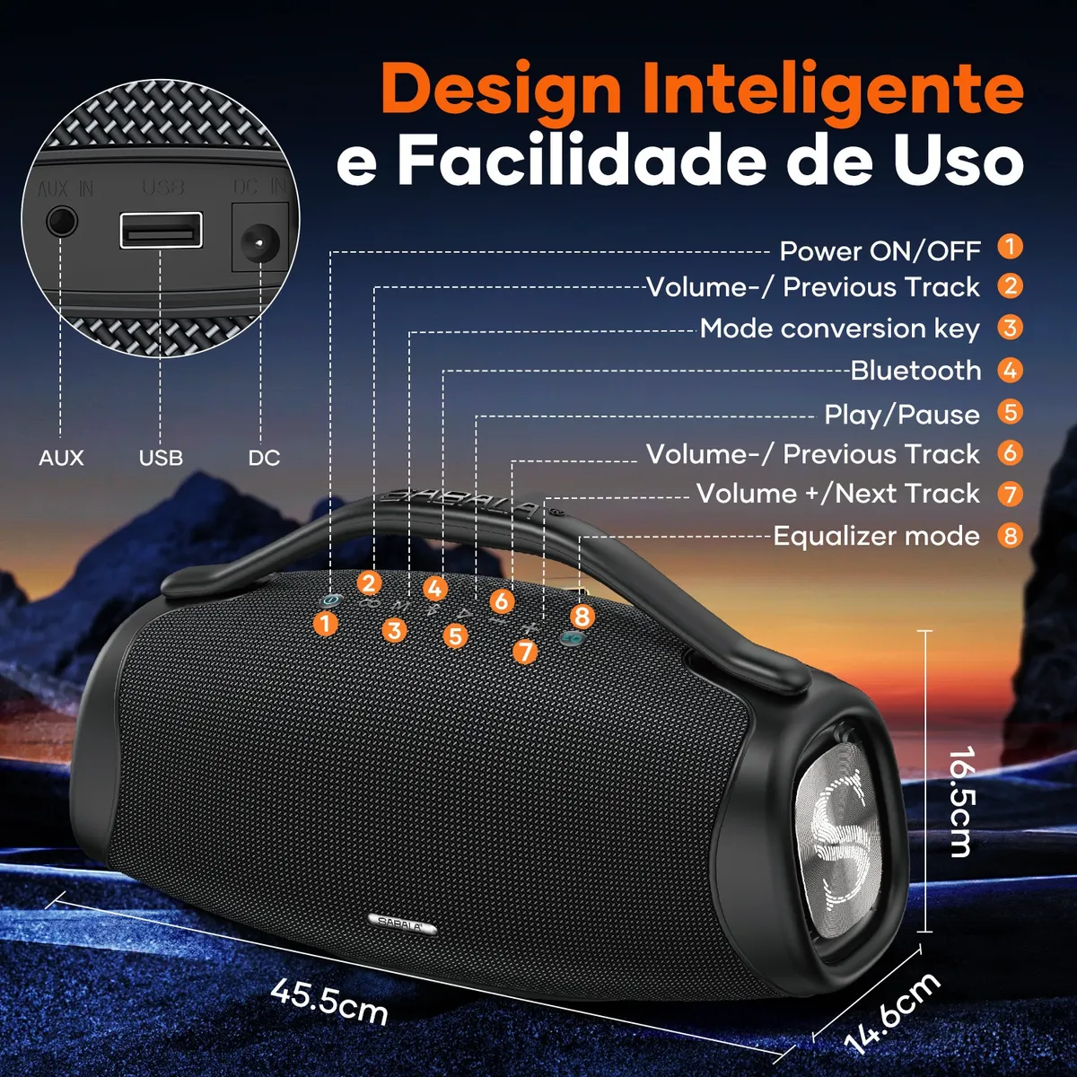 A Sabala Dr‑909 Caixa De Som Bluetooth,39000mAh 200W IPX6 é uma caixa de som Bluetooth portátil de alta potência e autonomia, ideal para quem quer levar música de qualidade para qualquer lugar — seja em festas, encontros, praia, acampamentos ou atividades ao ar livre. Com potência de 200 W RMS, resistência à água IPX6, bateria superpotente e tecnologia TWS, ela proporciona um som imersivo e duradouro em qualquer ambiente.