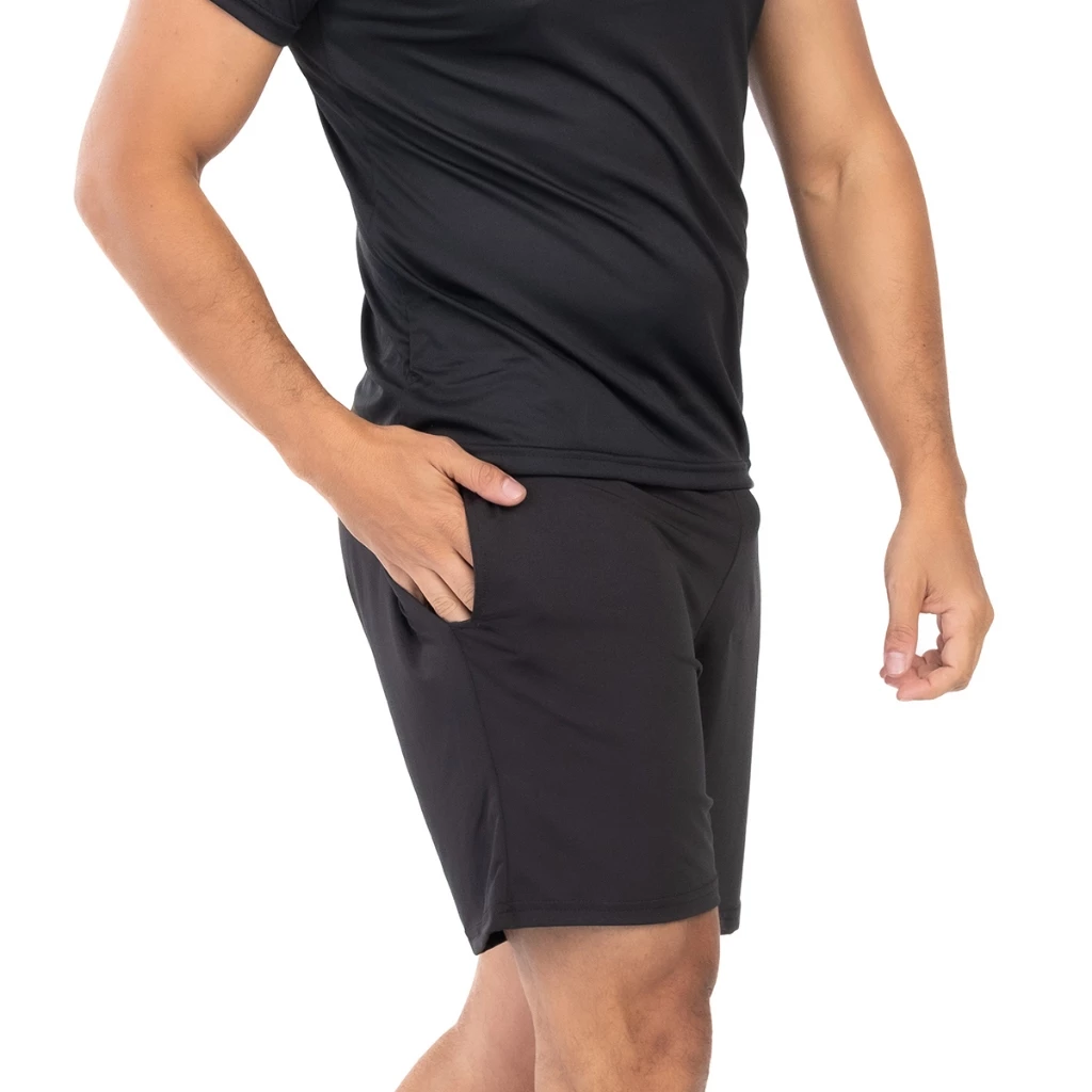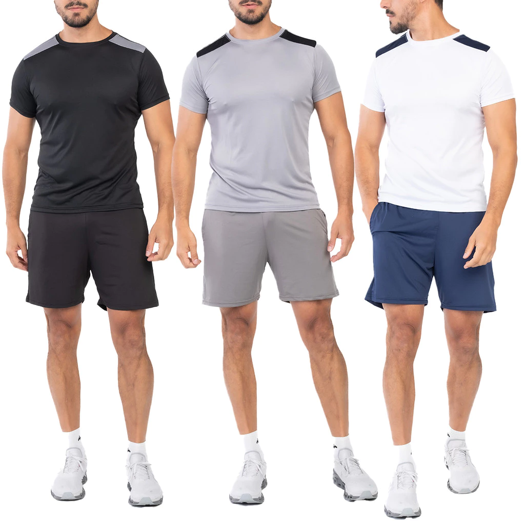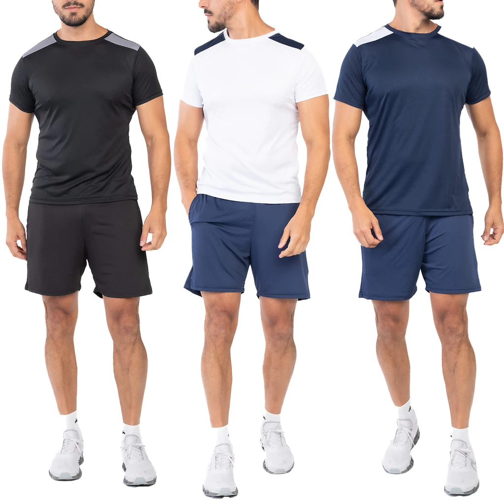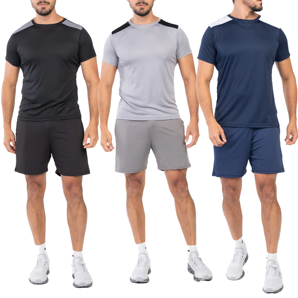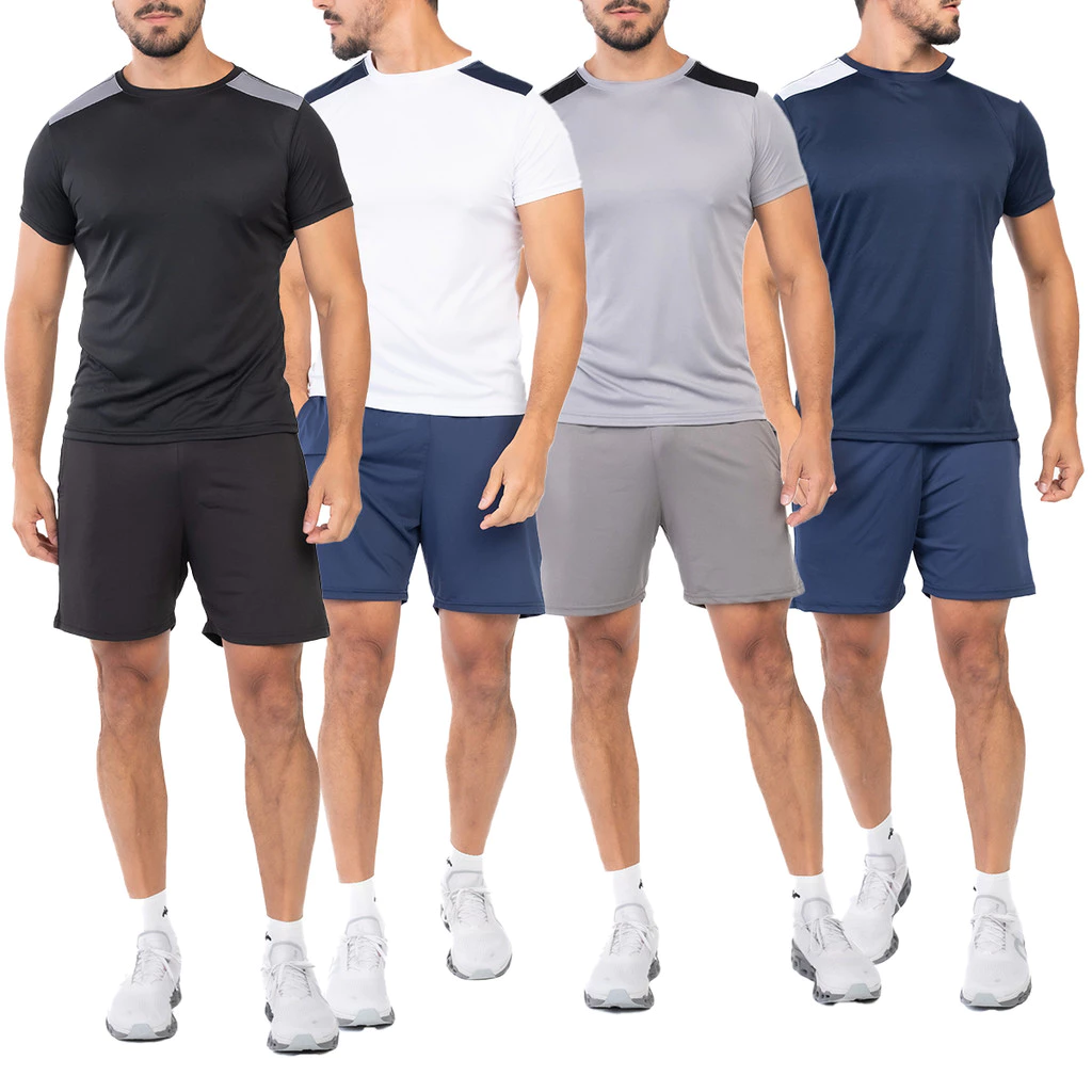 Kit com 4 camisetas e 4 bermudas masculinas em tecido Dryfit com elastano, ideal para atividades físicas e uso casual. Conforto, mobilidade e ótimo custo-benefício para o seu guarda-roupa esportivo.